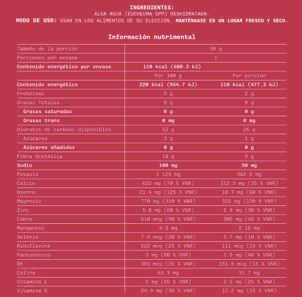 Naturalmente rica en minerales, fibra, antioxidantes y compuestos bioactivos, esta alga potencia tu salud desde adentro.